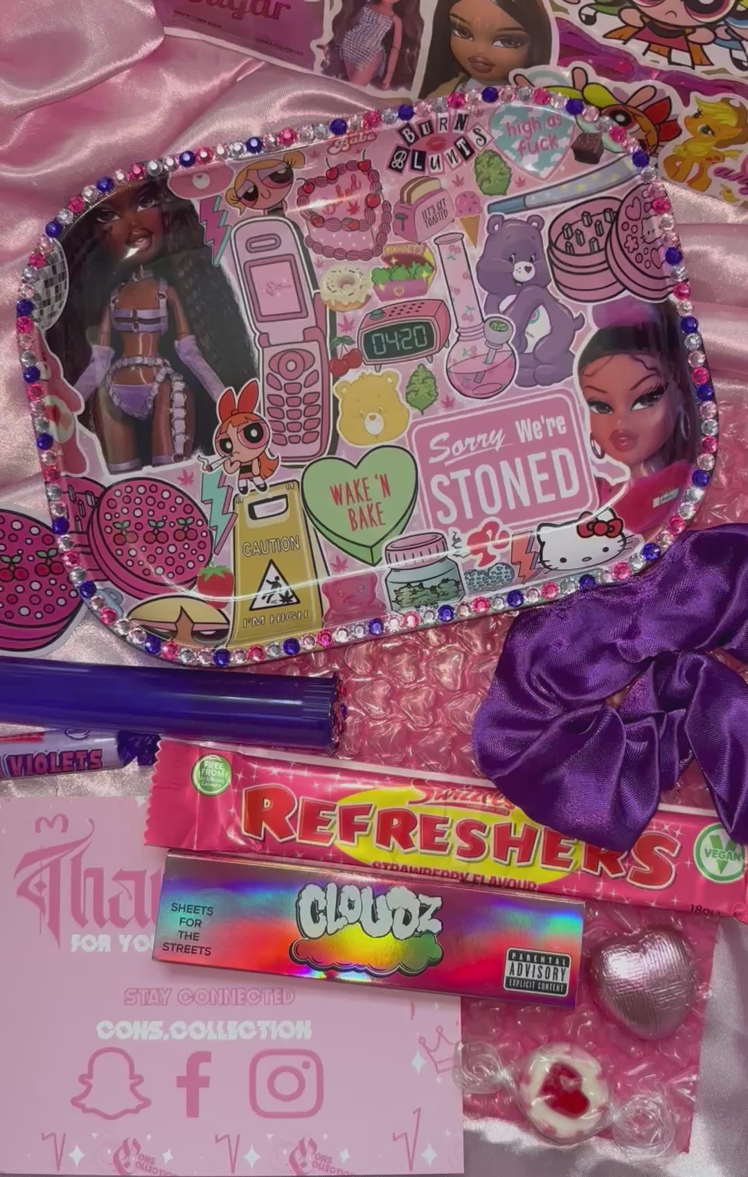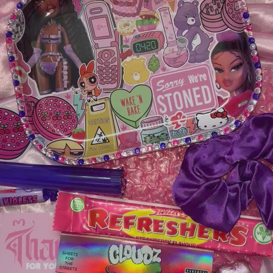 Sweets/Scrunchie/Dube tube will vary but will always match the pink/purple theme